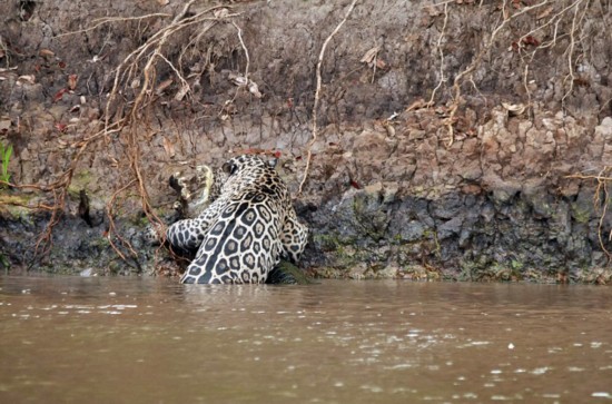 據英國《每日郵報》報道,近日,在巴西北潘塔納爾的一條小河岸邊,女導游利恩·吉利斯(Leen Gillis)拍攝到了一場長達20分鐘的精彩戰斗。