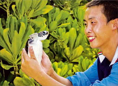 “像七連嶼那邊,很多漁民都上岸工作了,有的還參與海龜保護,那小海龜看上去肉肉的,特別好玩。”飛哥一邊說著,一邊給顧客結賬。菜價很親民:小石斑魚50元一斤,紅口螺20元一斤,青菜10來塊錢一份。食材普通,勝在新鮮。顧客一掏口袋,零錢不夠。飛哥很瀟灑地擺擺手:“沒關系,用微信支付就行,還免得找零錢。”